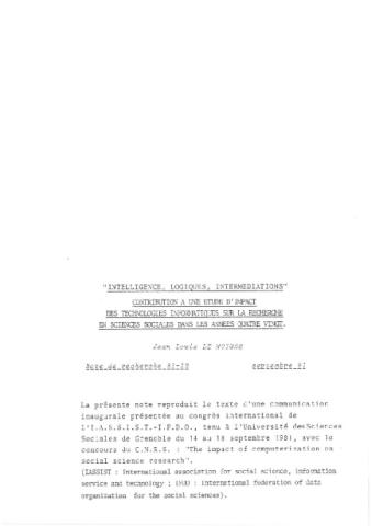 Intelligence, logiques, intermédiations. Contribution à un étude d'impact des technologies informatiques sur la recherche en sciences sociales dans les années 1980