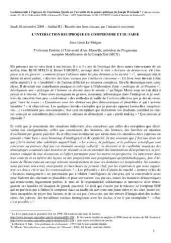 Intervention à au Colloque International ATD Quart Monde, J Wrezinsky, IEP Paris 127 XII 08, ‘Atelier H1,R "des liens sociaux par l’initiative citoyenne".