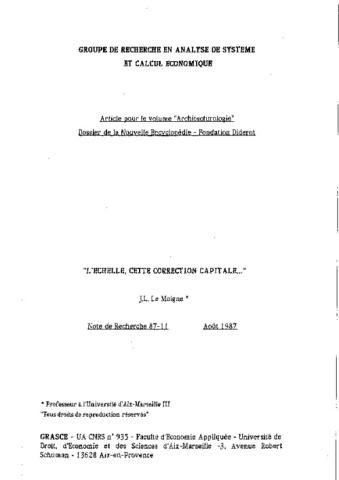 Communication au séminaire "Penser l'architecture" à l'Institut français d'architecture, p.10-14/10-32 des actes du colloque (Juillet 1987). NrG n°88-11, 20 pages (Novembre 1988).