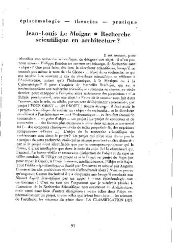 Communication présentée aux rencontres recherche-architecture organisées par le secrétariat de la recherche architecturale (Paris, 12-13-14 Juin 1984). Publiée dans les Actes "la recherche en architecture, un bilan international" ed. Parenthèses, Paris 1986, pages 97/102.