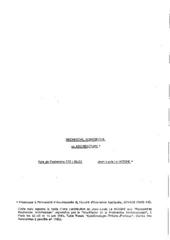 Communication présentée aux rencontres recherche-architecture organisées par le secrétariat de la recherche architecturale (Paris, 12-13-14 Juin 1984). Publiée dans les Actes "la recherche en architecture, un bilan international" ed. Parenthèses, Paris 1986, pages 97/102.
