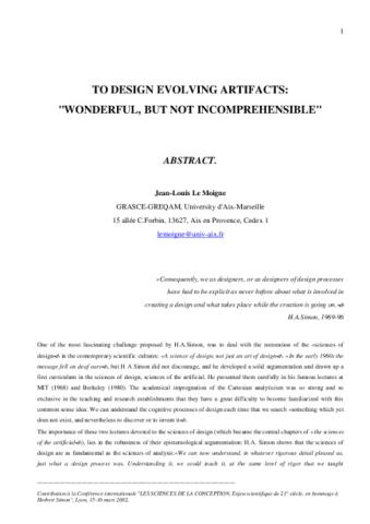 Abstract en anglais "To Design Evolving Artifacts. « Wonderful, but not incomprehensible" de la conférence plénière présentée à la Conférence internationale "Les sciences de Conception, l'enjeu scientifique du 21° siècle, en hommage à Herbert Simon, INSA-LYON –MCX, Lyon, 15-16 mars 2002.