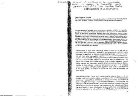 Communication présentée au colloque "La science et la pratique de la complexité" organisé par l'Université des Nations Unies (Montpellier, 8-11 Mai 1984), p.47/78 des actes (La Documentation Française, 1986). La version anglaise, intitulée "The intelligence of complexity", a été publiée dans les actes du colloque de l'U.N.U. "The science and praxis of complexity", p.35/61 (1985).