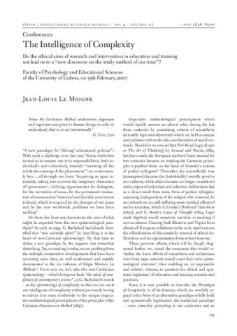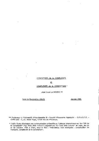 Communication au colloque international sur le thème "Les défis de la complexité" — "La sfida della complessità" — (Milan, 25-26 Octobre 1984), p.85/102 des actes du colloque. La version française intitulée "Conception de la complexité et complexité de la conception" sera notamment publiée ultérieurement dans la "Revue Internationale de Systémique" Vol. 4 (1990), n°2, p.290/318.