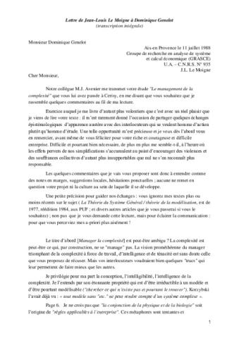 Lettre adressée par Jean-Louis Le Moigne à Dominique GENELOT au sujet du premier du livre à paraître en 1992 "Manager dans la complexité" et intitulé initialement "Manager la complexité".